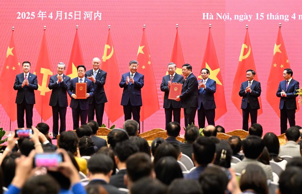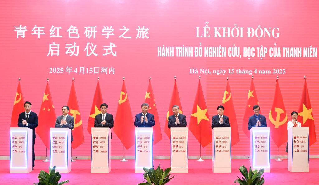習近平(しゅう・きんぺい)中國共産黨中央委員會総書記・國家主席は15日、ベトナム・ハノイの國際コンベンションセンターで、同國のトー・ラム共産黨書記長、ルオン・クオン國家主席と共に中越人民大交歓活動の代表と會見した。寫真は會見後、「赤色研學の旅」プロジェクトの始動式に共に出席した習近平氏、トー・ラム氏、ルオン・クオン氏。(ハノイ=新華社記者/申宏)