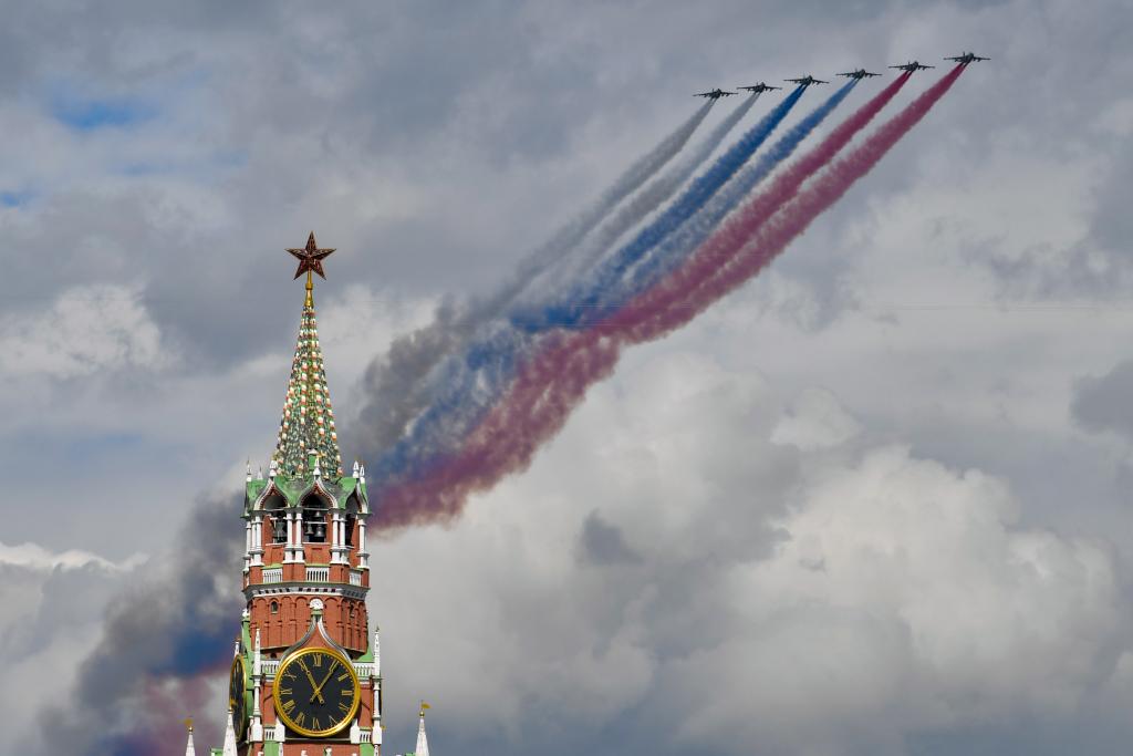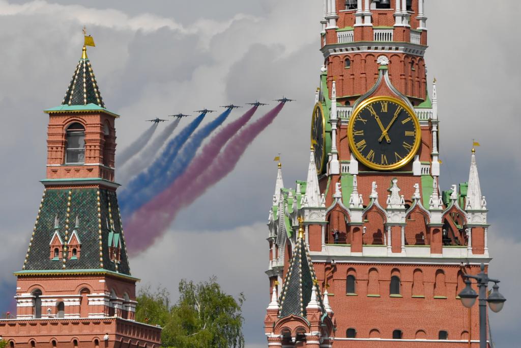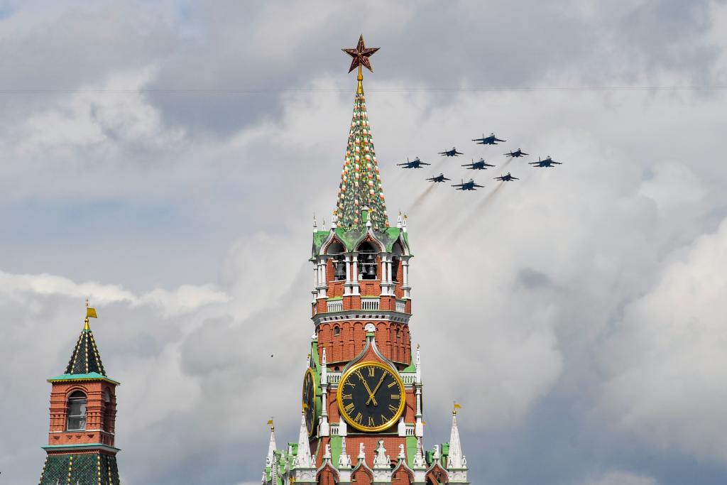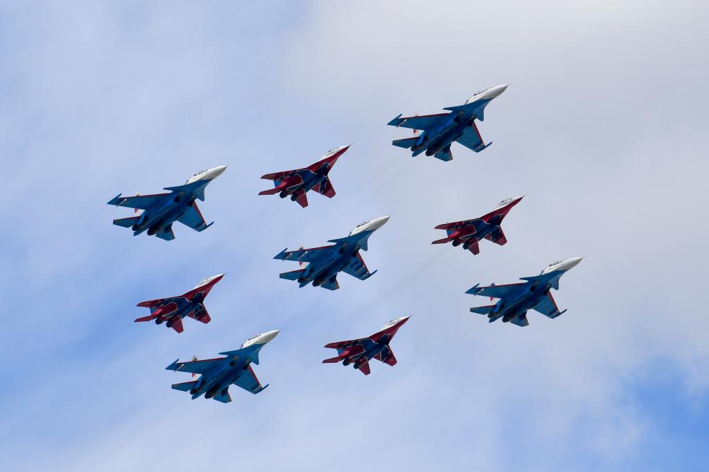 7日、閲兵式のリハーサルに參加した戦闘機の編隊。(モスクワ=新華社配信)