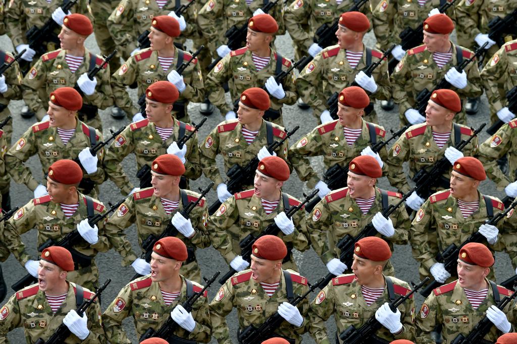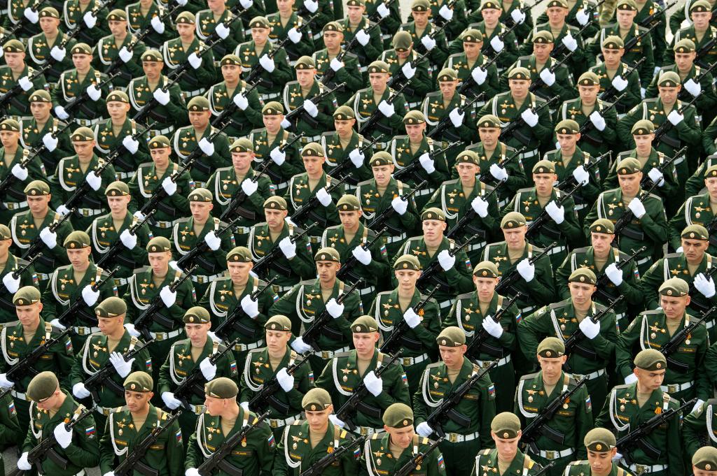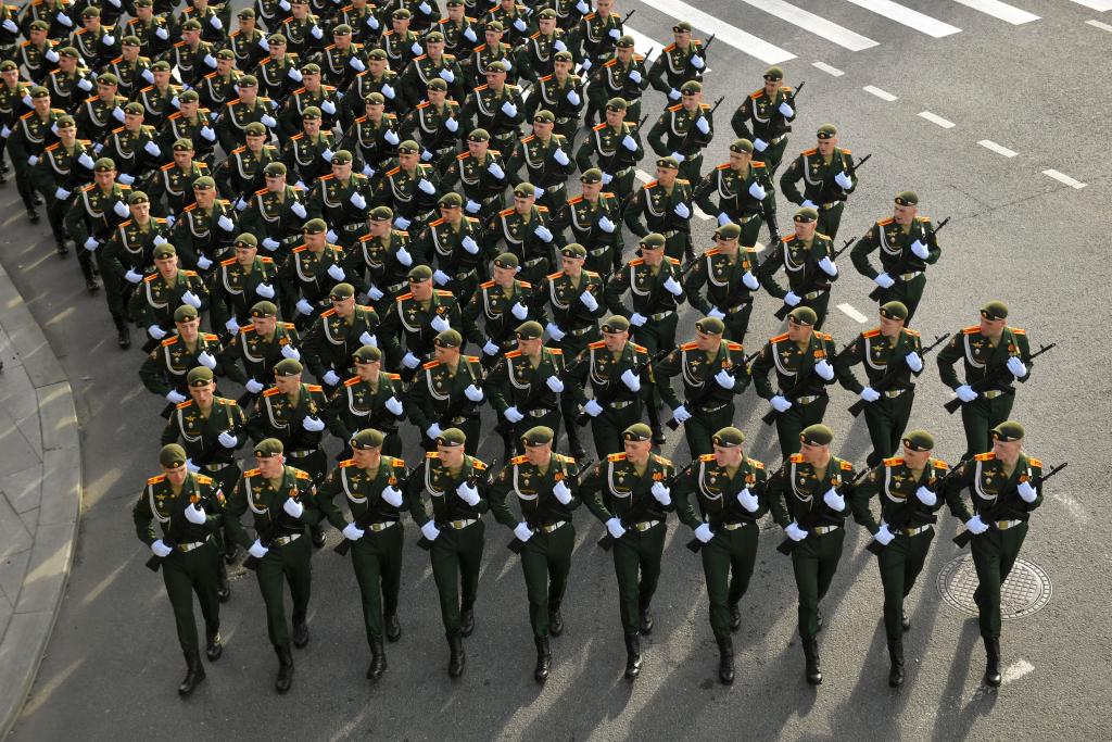 7日、閲兵式のリハーサルに臨む兵士ら。(モスクワ=新華社配信)
