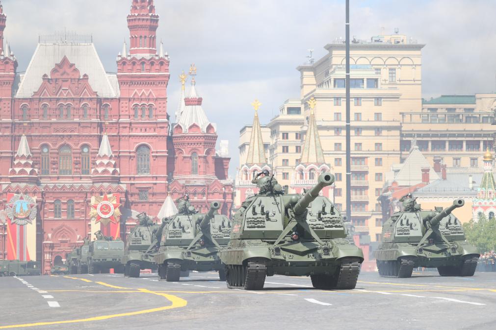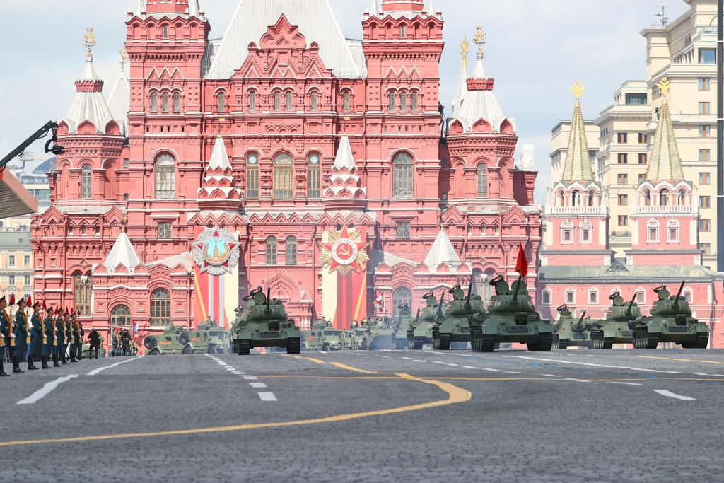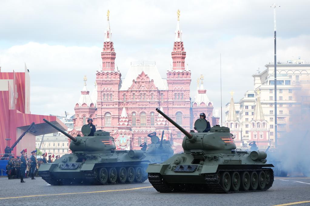 9日、ロシア・モスクワで、ソ連大祖國戦爭勝利80周年を記念する閲兵式に參加した戦車。(モスクワ=新華社記者/白雪騏)