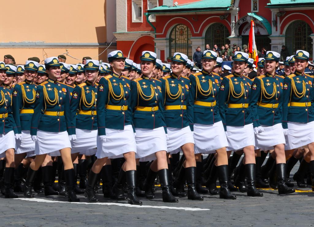 9日、ロシア・モスクワで行われたソ連大祖國戦爭勝利80周年を記念する閲兵式で行進する女性兵士。(モスクワ=新華社記者/姚大偉)