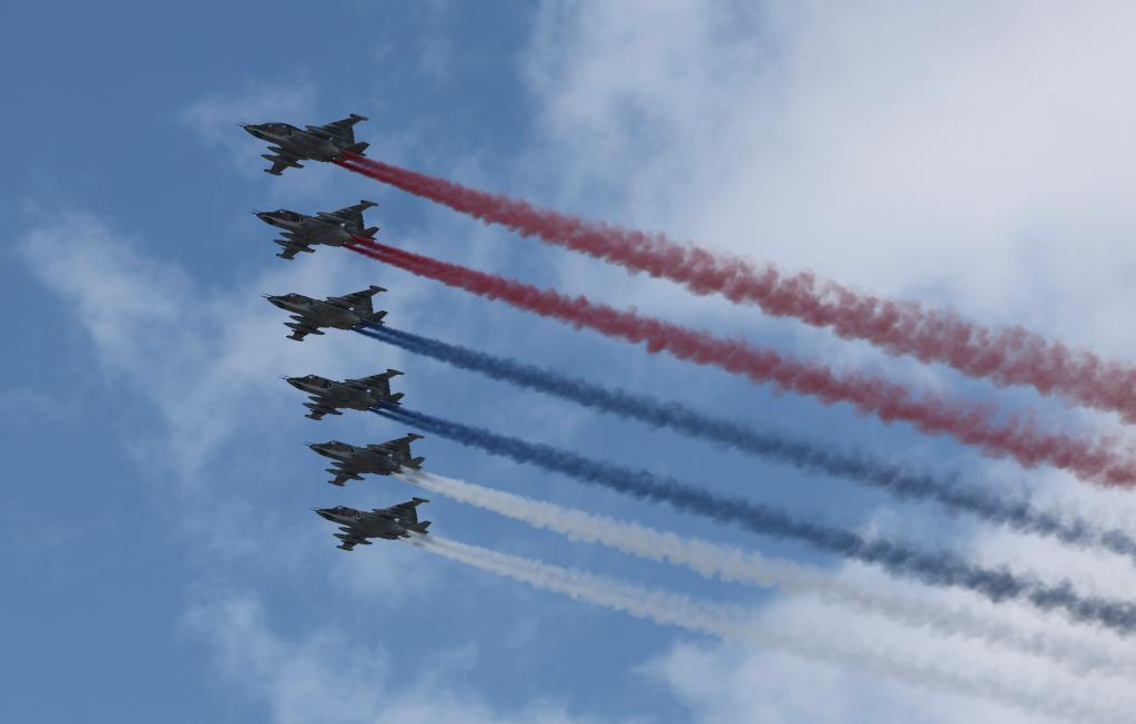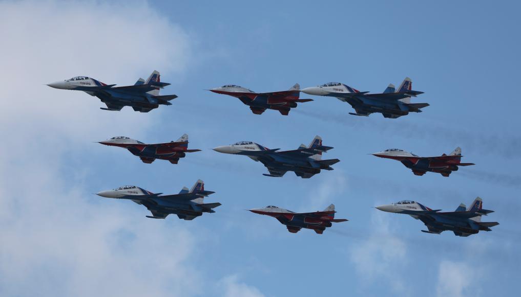 9日、ロシア・モスクワで、ソ連大祖國戦爭勝利80周年を記念する閲兵式に參加した戦闘機の編隊。(モスクワ=新華社配信)