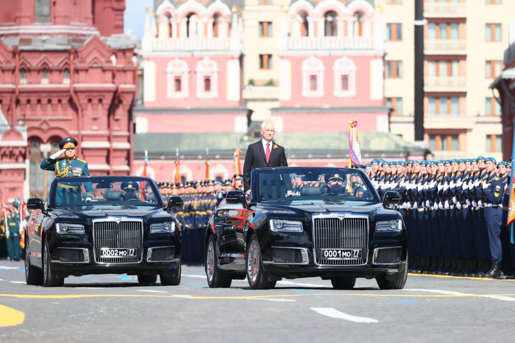9日、ロシア・モスクワで行われたソ連大祖國戦爭勝利80周年を記念する閲兵式で、部隊を観閲するベロウソフ國防相(手前右)。(モスクワ=新華社記者/白雪騏)