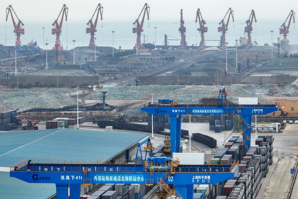 広西チワン族自治區北海市の鉄山港區にある西部陸海新ルート北海複合輸送センター。(3月13日撮影、南寧=新華社記者/曹禕銘)