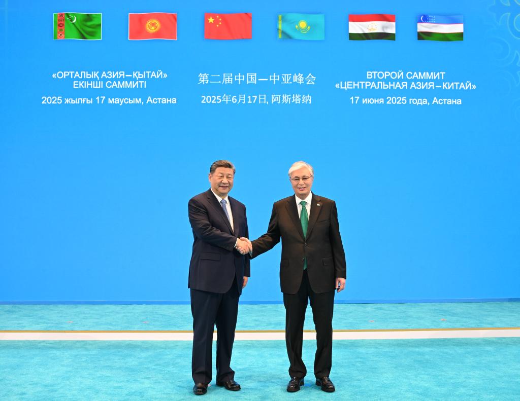 第2回中國・中央アジアサミットは17日、カザフスタン・アスタナの獨立宮殿で開催された。カザフスタンのトカエフ大統領が議長を務めた。中國の習近平(しゅう・きんぺい)國家主席はキルギスのジャパロフ大統領、タジキスタンのラフモン大統領、トルクメニスタンのベルドイムハメドフ大統領、ウズベキスタンのミルジヨエフ大統領と共に出席した。寫真はトカエフ氏と握手を交わす習近平主席。(アスタナ=新華社記者/謝環馳)