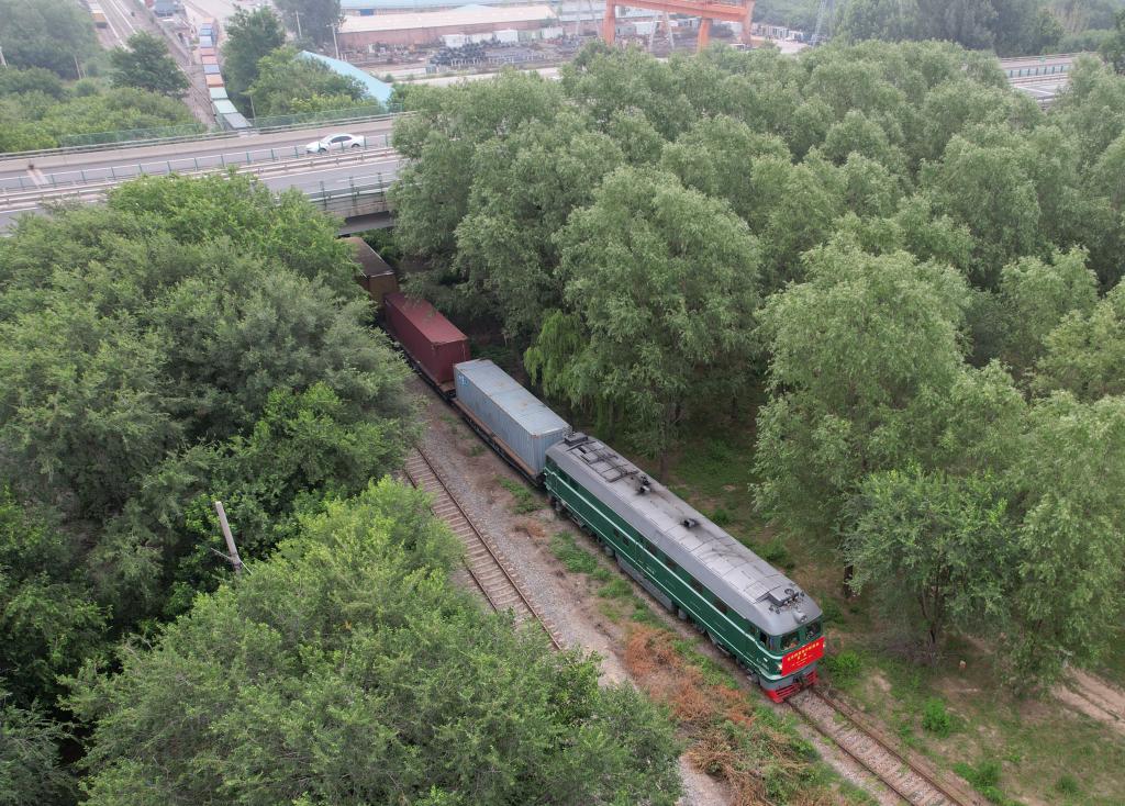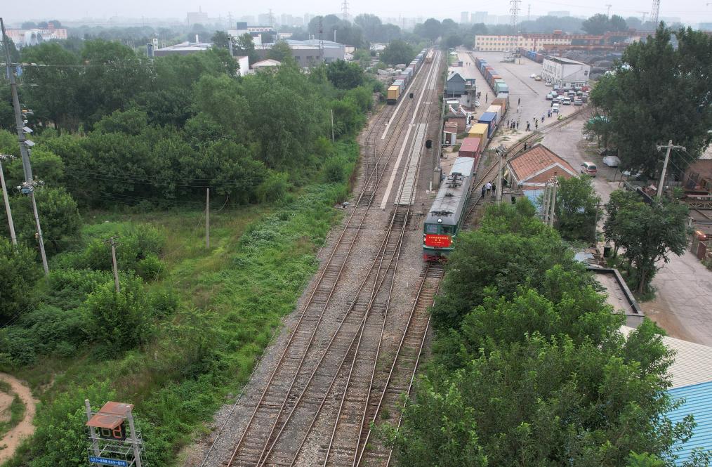 6月30日、北京市房山區の北京國際陸港で出発を待つカスピ海橫斷中歐班列。(北京=新華社記者/張晨霖)