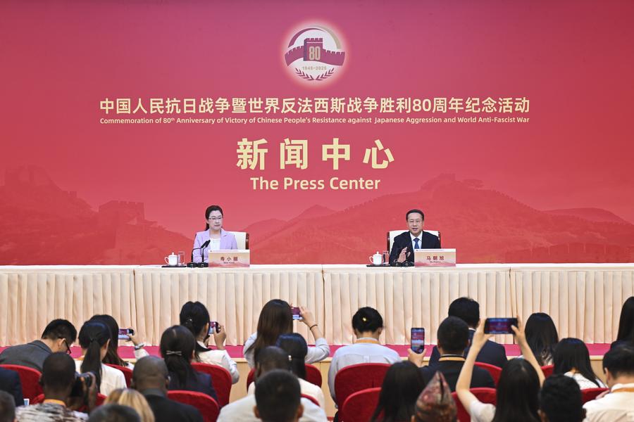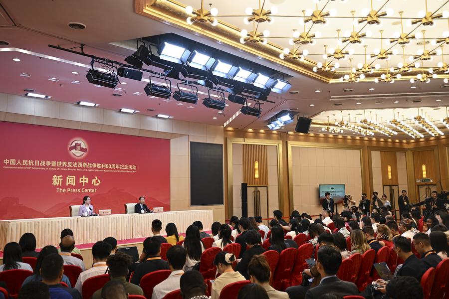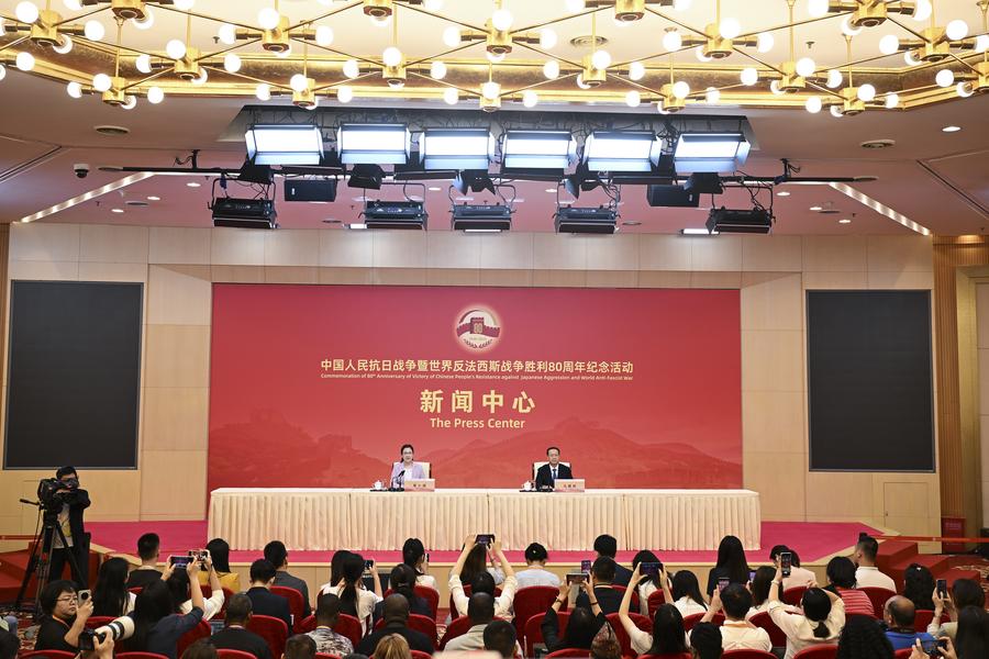 29日、中國人民抗日戦爭・世界反ファシズム戦爭勝利80周年記念活動のプレスセンターが開いた2回目の記者発表會。(北京=新華社記者/金良快)
