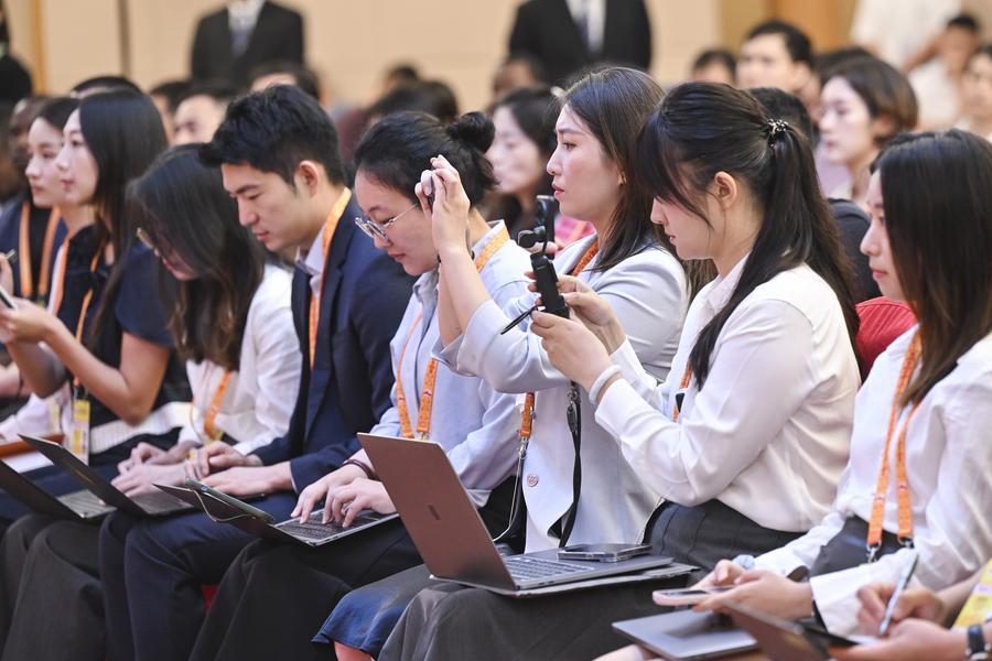 29日、2回目の記者発表會を取材する報道関係者。(北京=新華社記者/金良快)
