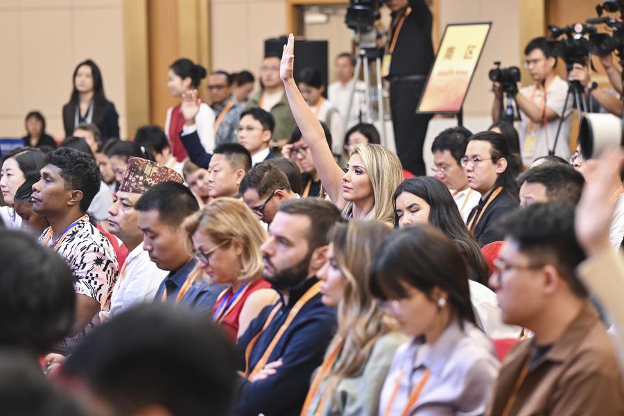 29日、2回目の記者発表會で挙手する記者。(北京=新華社記者/金良快)