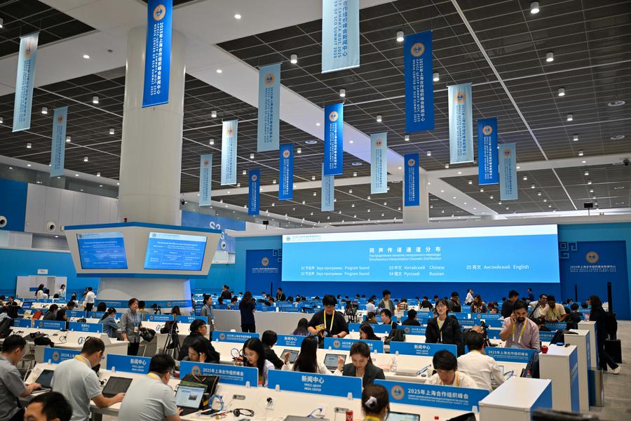 30日、2025年SCOサミットのプレスセンター。(天津=新華社記者/孫凡越)