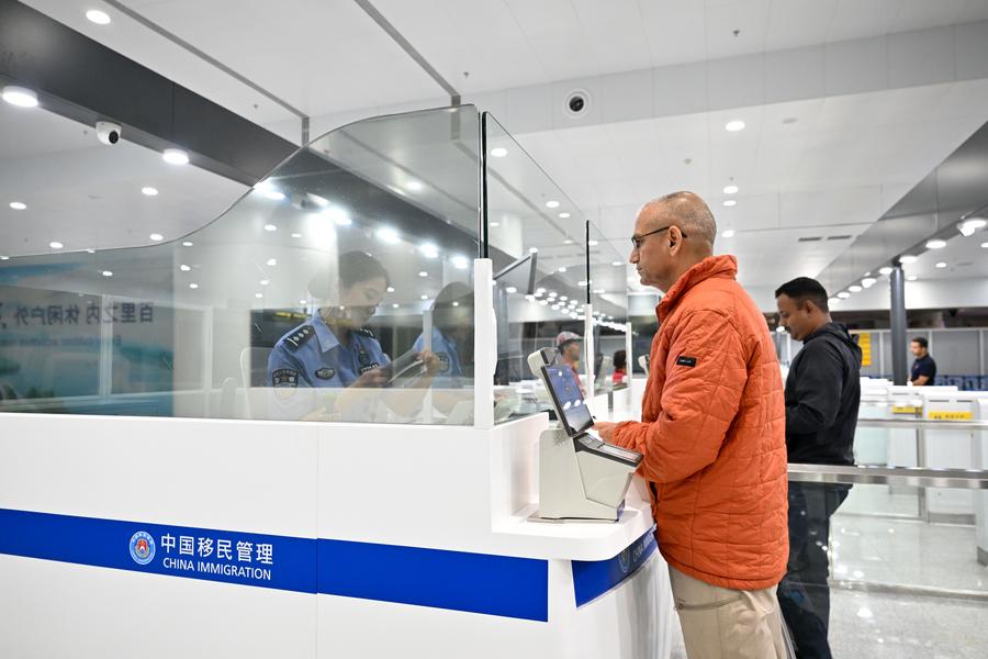27日、天津浜海國際空港第1ターミナルで、外國人記者の入國審查を行う&&境辺防検查站(&&國検查所)の警察官。(天津=新華社記者/孫凡越)