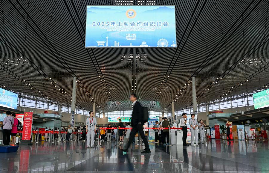 27日、2025年SCOサミットの垂れ幕が掲げられた天津浜海國際空港第2ターミナルの出発ホール。(天津=新華社記者/孫凡越)