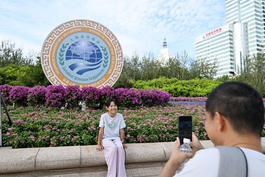 28日、天津市の海河沿いに設置されたSCOサミットのモニュメントの前で記念撮影する観光客。(天津=新華社記者/趙子碩)