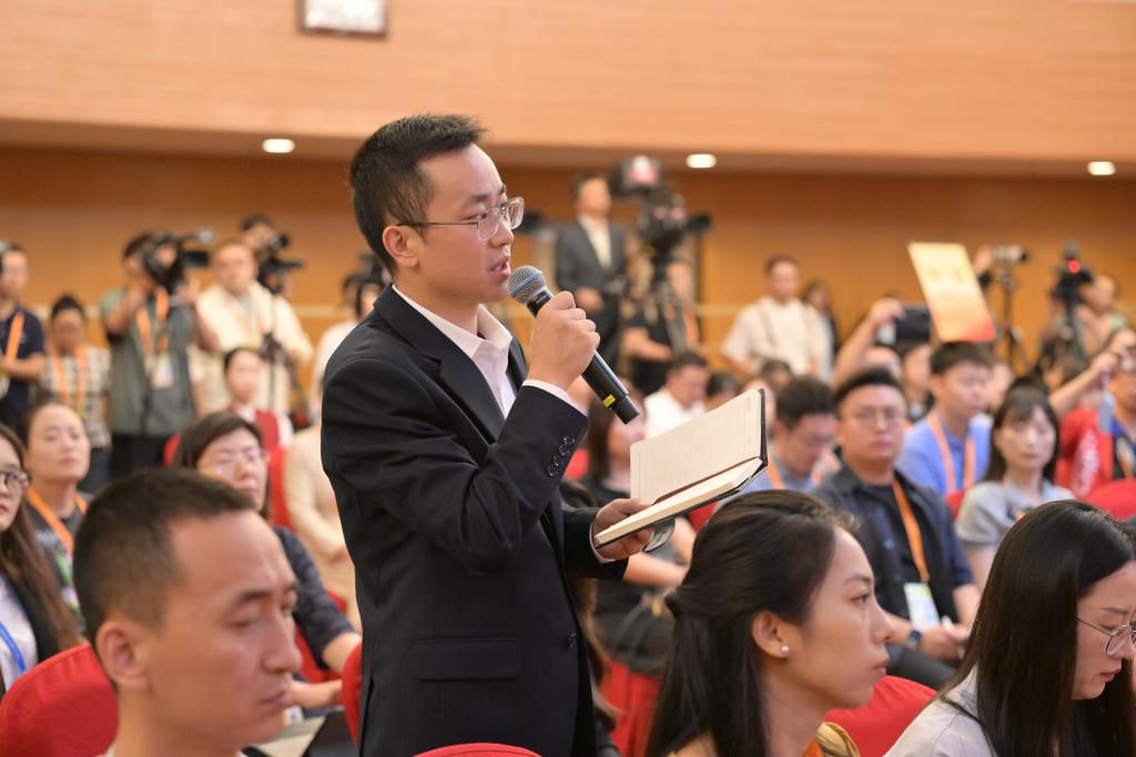 31日、中國人民抗日戦爭・世界反ファシズム戦爭勝利80周年記念活動プレスセンターの第3回記者発表會で質問する記者。(北京=新華社記者/李賀)