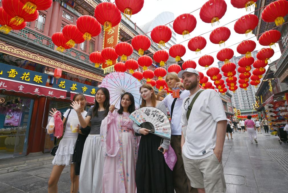 14日、天津市內の古文化街で記念撮影するSCO加盟國學生。(天津=新華社記者/李然)