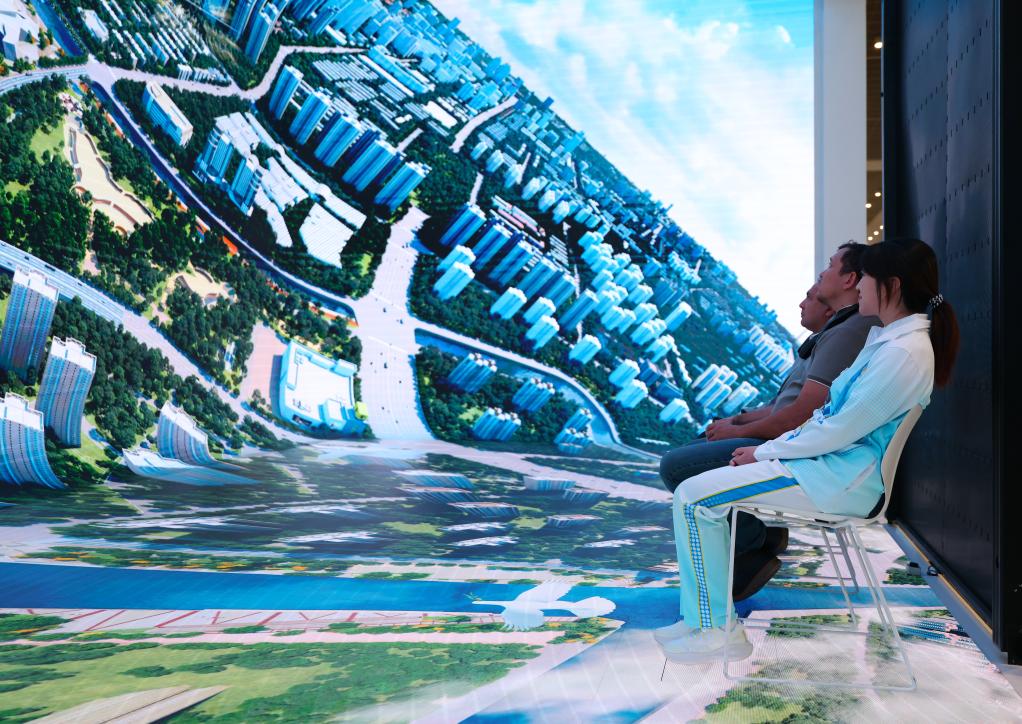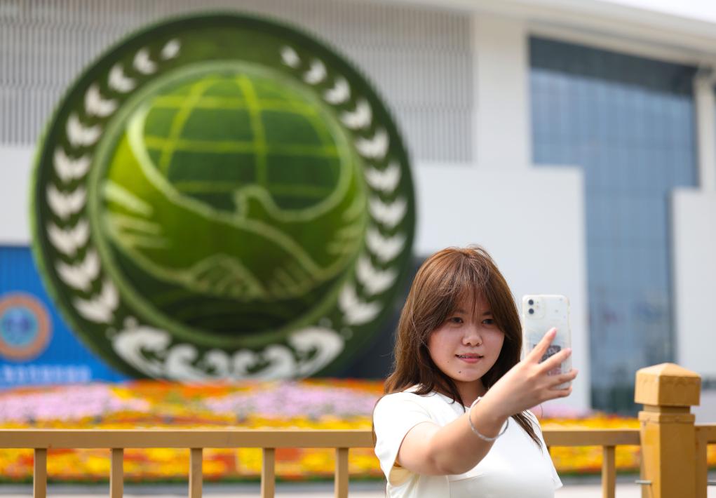 29日、天津市內の梅江エキシビション・コンベンションセンターを背景に記念撮影する市民。(天津=新華社記者/楊青)