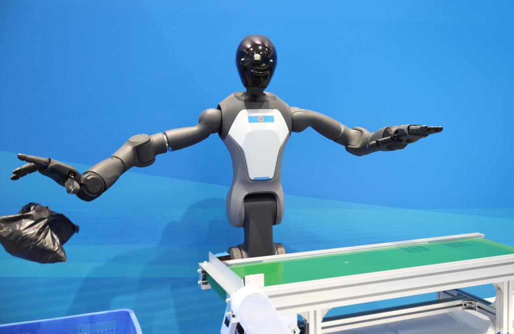 29日、SCOサミット・プレスセンターで、スマート物流システムの荷物仕分け作業を実演するロボット。(天津=新華社記者/楊青)