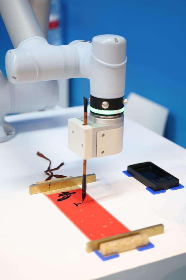 29日、SCOサミット・プレスセンターで、書道を披露するスマートロボット。(天津=新華社記者/楊青)
