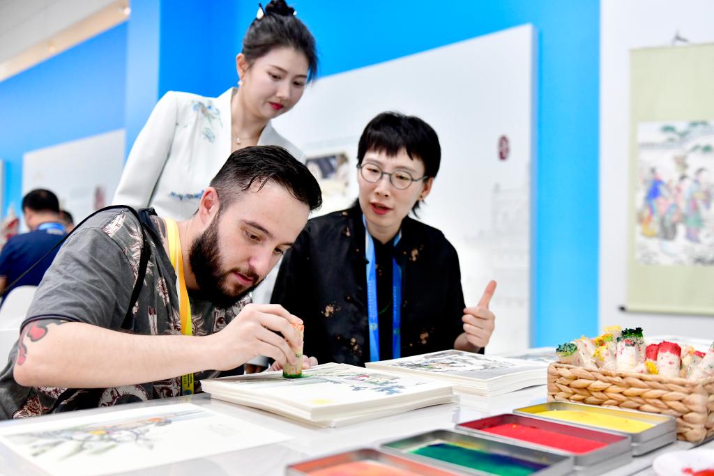29日、SCOサミット・プレスセンターの無形文化遺産展示エリアで、天津市に伝わる楊柳青木版年畫を體験する海外の報道関係者(左)。(天津=新華社記者/郭緒雷)