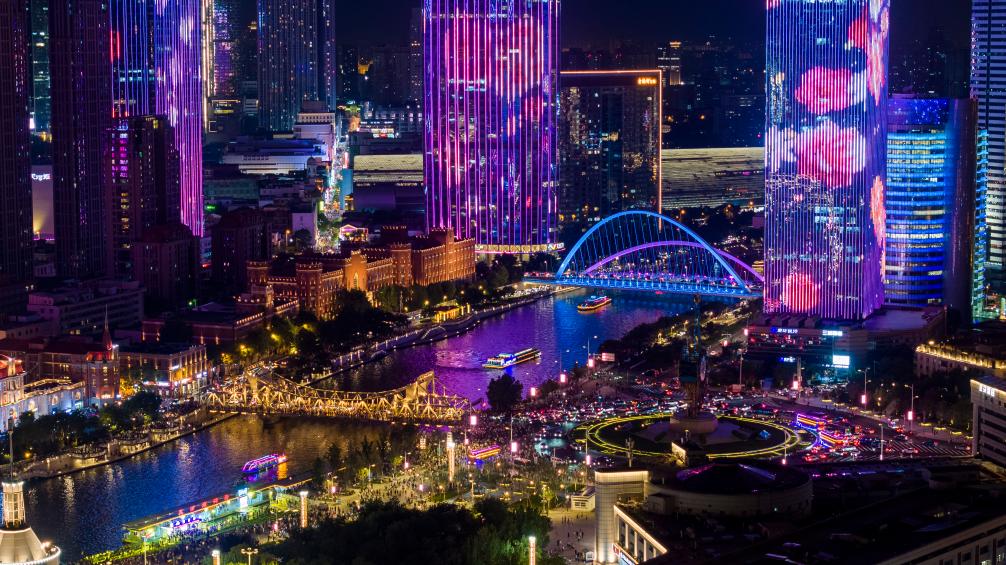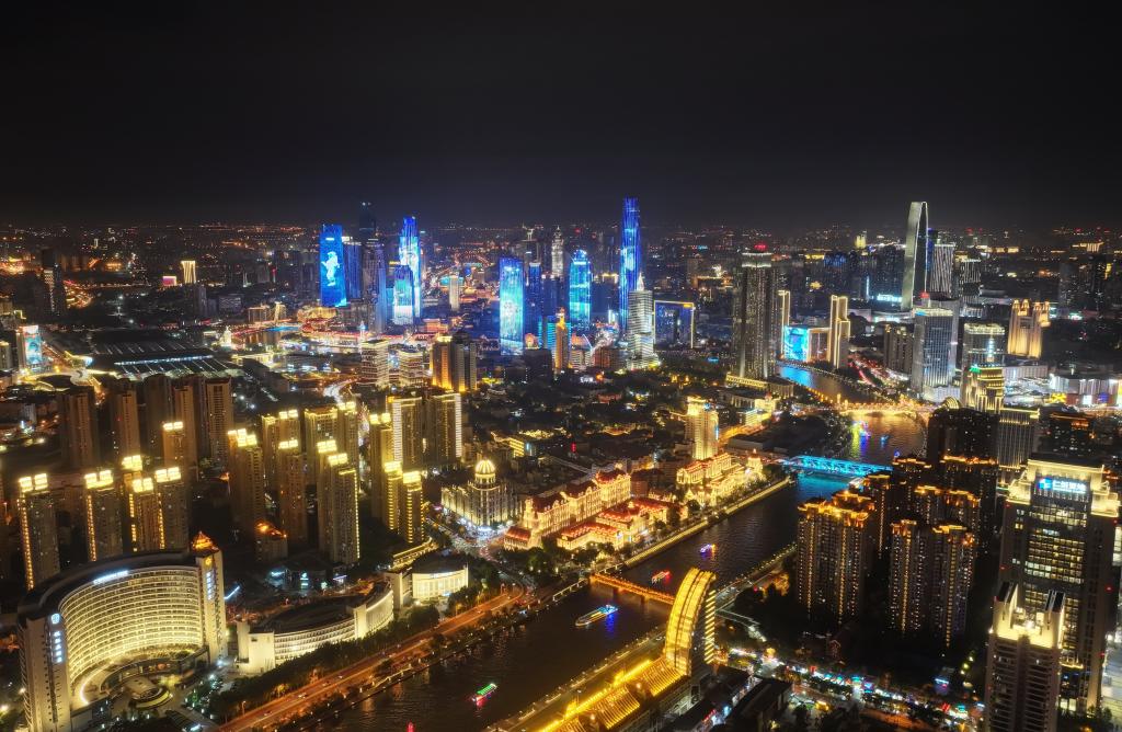 22日、天津市內を流れる海河の夜景。(ドローンから、天津=新華社記者/趙子碩)