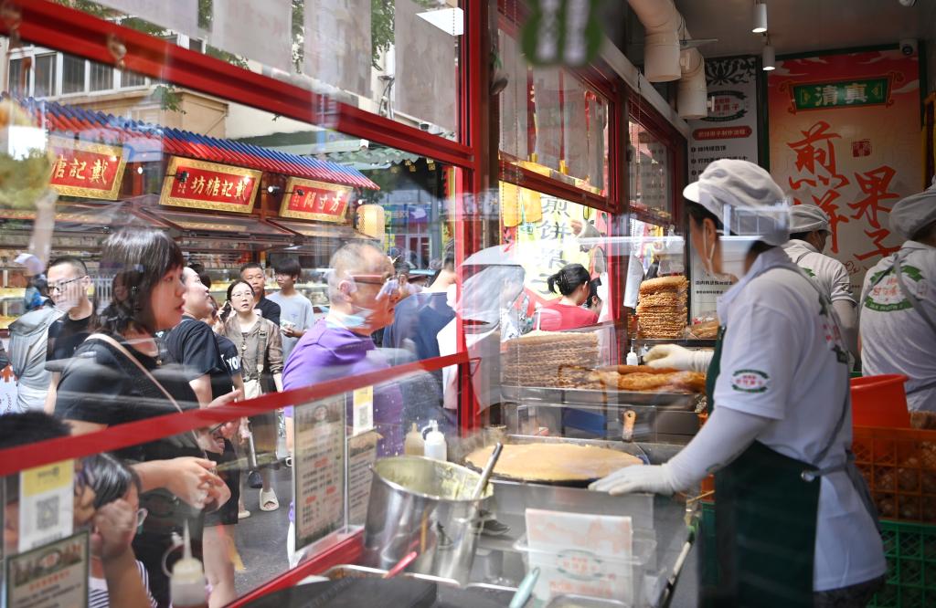 22日、天津市紅橋區の西北角特色街區で地元名物を買う観光客。(天津=新華社記者/李然)