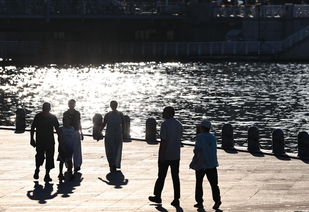 25日、天津市內を流れる海河のほとりを散歩する市民。(天津=新華社記者/孫凡越)
