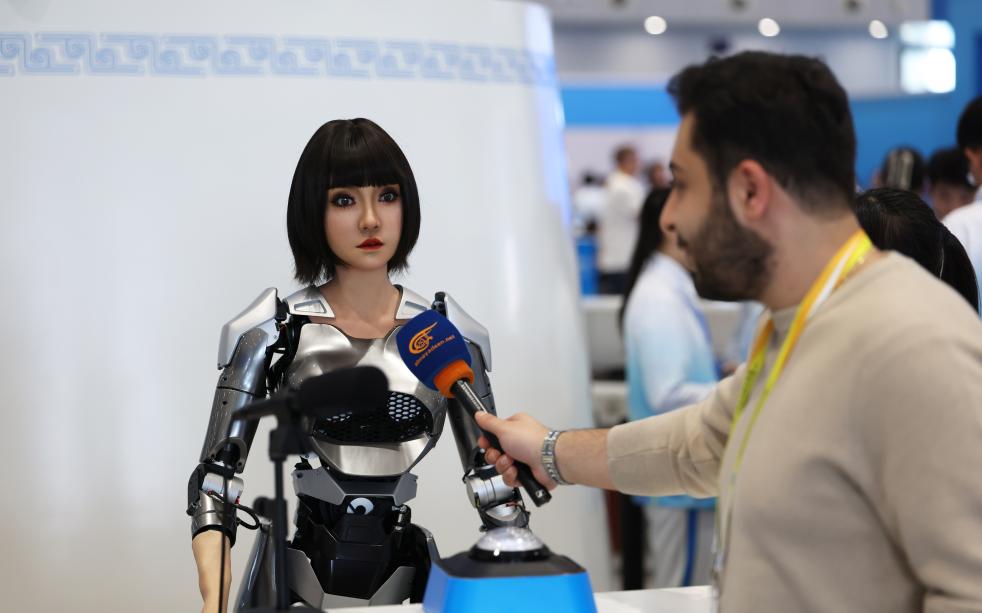 29日、SCOサミット・プレスセンターで人型ロボット「小合」にインタビューする海外の報道関係者。(天津=新華社記者/楊青)