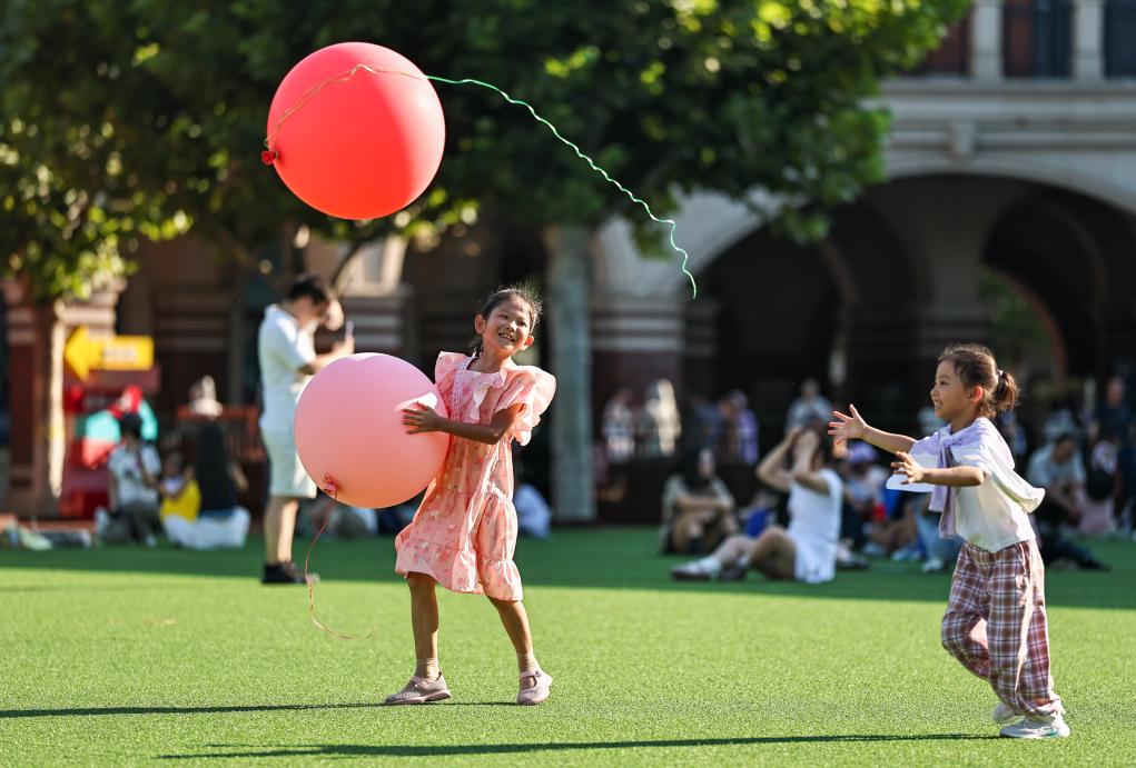 25日、天津市の五大道歴史文化街區にある民園広場で遊ぶ子ども。(天津=新華社記者/孫凡越)