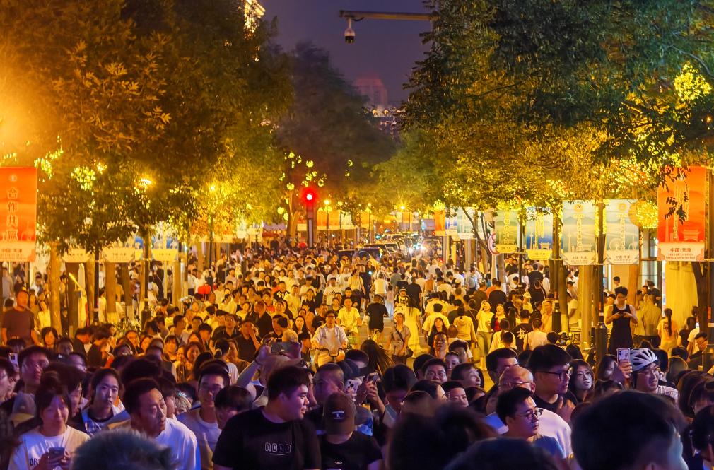 25日、天津市の解放北路を散策する観光客。(天津=新華社記者/孫凡越)