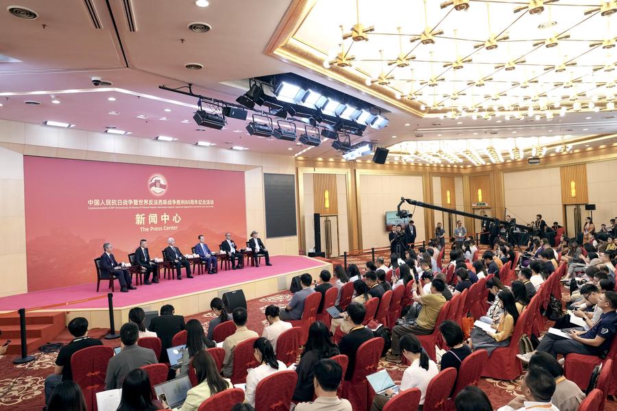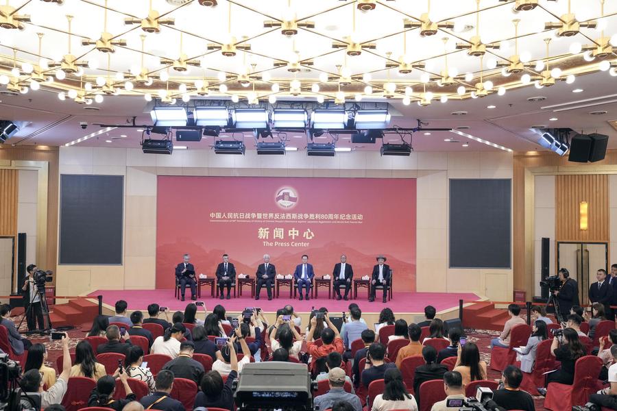 1日、中國人民抗日戦爭・世界反ファシズム戦爭勝利80周年記念活動プレスセンターの第2回記者會見。(北京=新華社記者/殷剛)