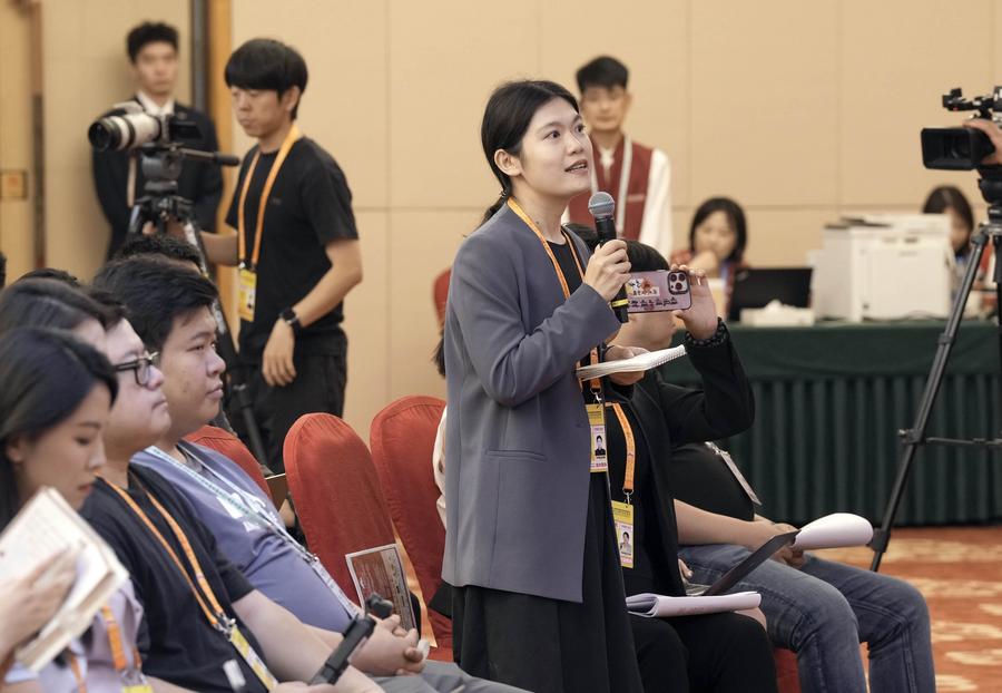 1日、中國人民抗日戦爭・世界反ファシズム戦爭勝利80周年記念活動プレスセンターの第2回記者會見で質問する記者。(北京=新華社記者/殷剛)