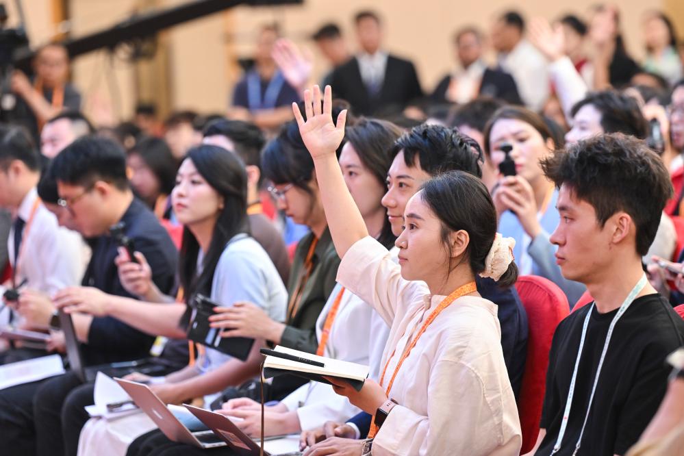 2日、中國人民抗日戦爭・世界反ファシズム戦爭勝利80周年記念活動プレスセンターの第3回記者會見で挙手する記者。(北京=新華社記者/金良快)