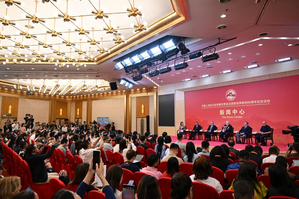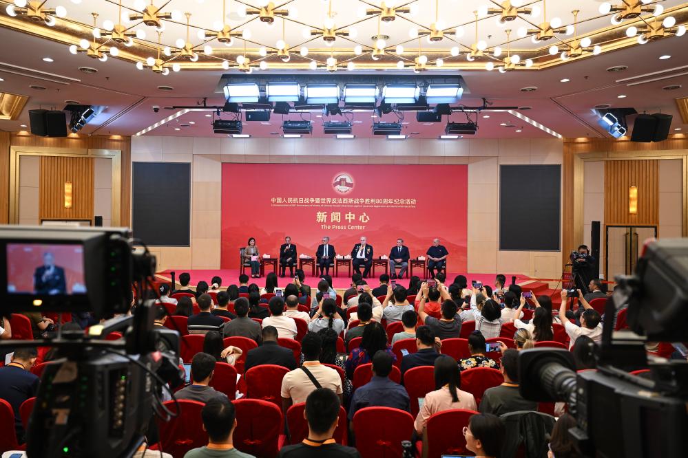 2日、中國人民抗日戦爭・世界反ファシズム戦爭勝利80周年記念活動プレスセンターの第3回記者會見。(北京=新華社記者/金良快)
