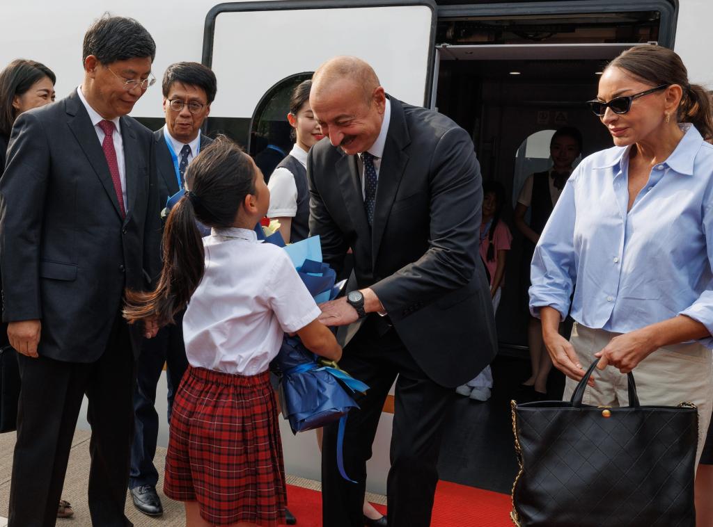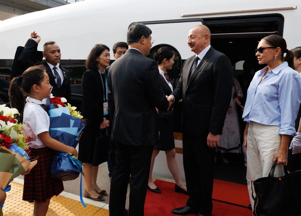 2日、北京に到着し、花束を受け取るアリエフ大統領(右から2人目)。(北京=新華社記者/金立旺)