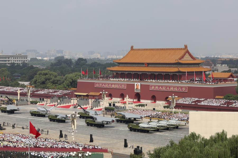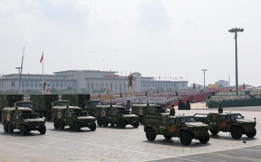 3日、観閲を受ける裝備方隊。(北京=新華社記者/張晨霖)