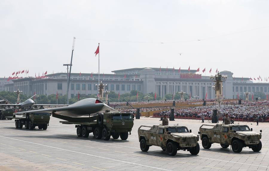 3日、観閲を受ける空中無人作戦機の方隊。(北京=新華社記者/陳誠)