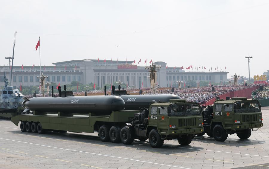 3日、観閲を受ける核ミサイルの第2方隊。(北京=新華社記者/陳誠)