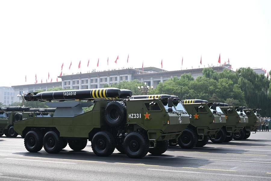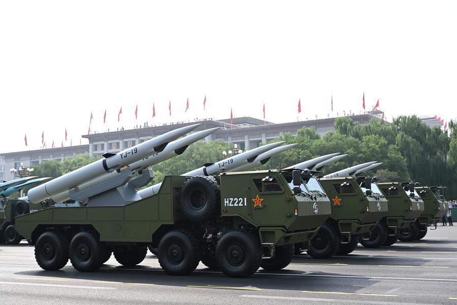 3日、閲兵式で観閲を受ける対艦ミサイル方隊。(北京=新華社記者/楊冠宇)