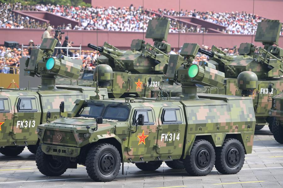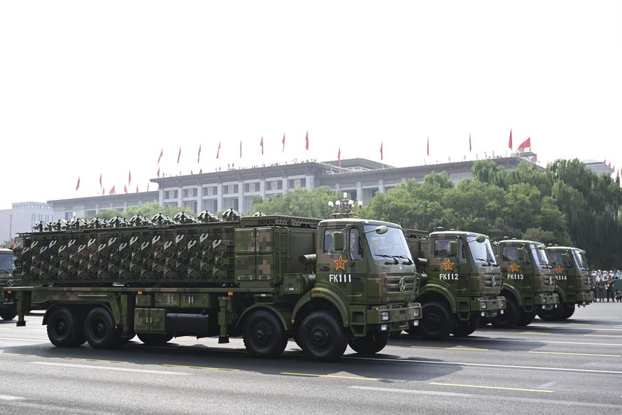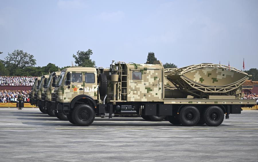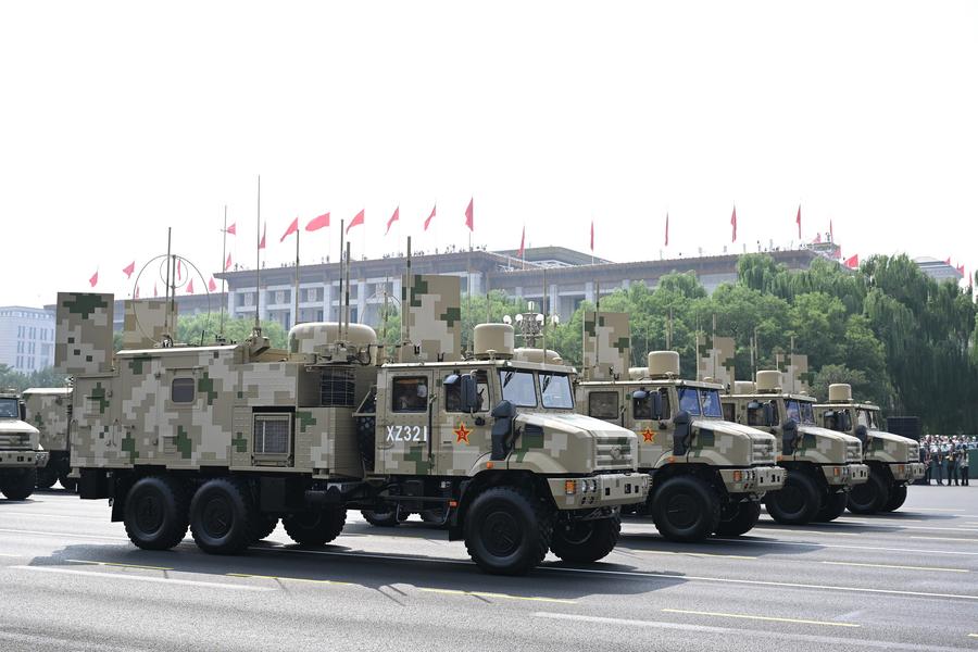 3日、閲兵式で観閲を受ける電子攻撃(ECM)部隊の隊列。(北京=新華社記者/楊冠宇)