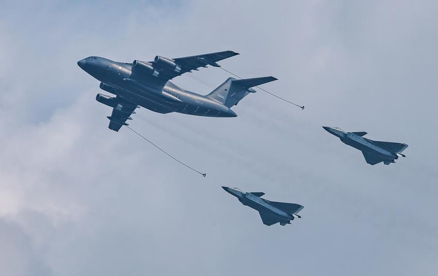 3日、閲兵式で観閲を受ける給油機と受油機からなる編隊。(北京=新華社記者/孫凡越)