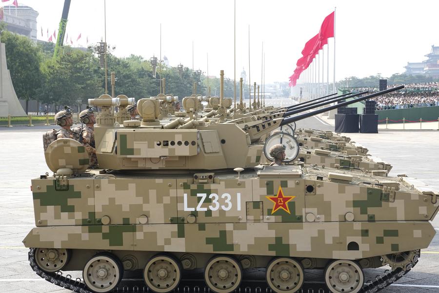 3日、観閲を受ける水陸両用突撃戦車の方隊。(北京=新華社記者/楊冠宇)
