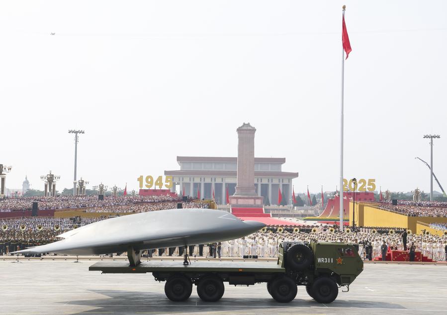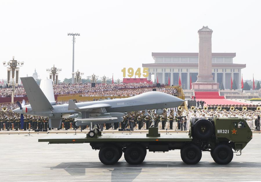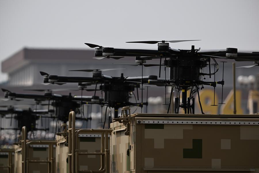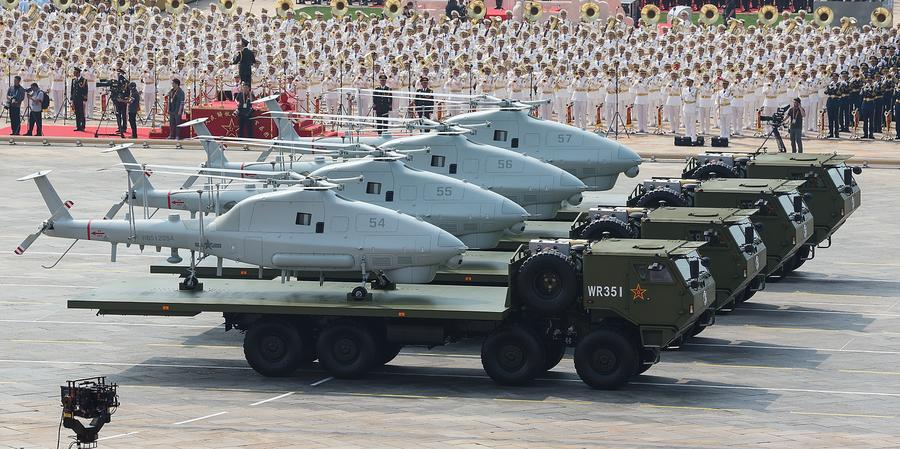 3日、観閲を受ける空中無人作戦方隊。(北京=新華社記者/劉大偉)