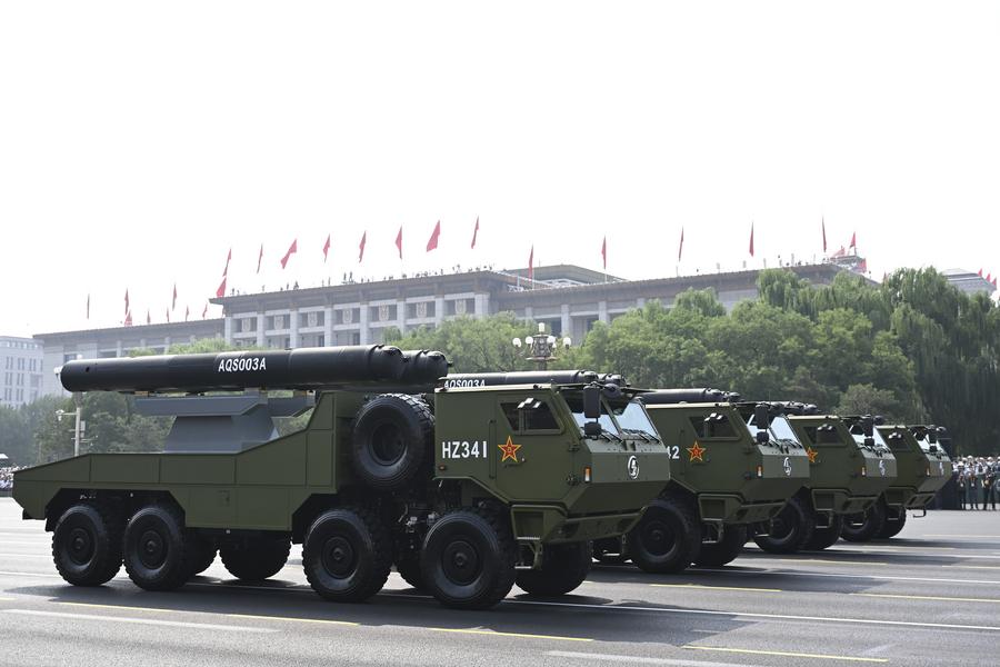 3日、閲兵式で観閲を受ける水中兵器方隊。(北京=新華社記者/楊冠宇)