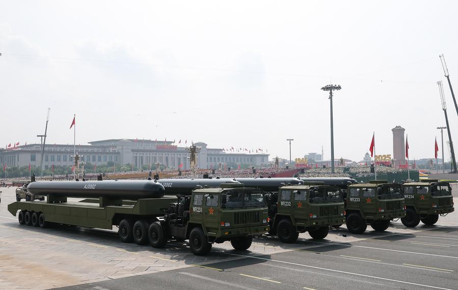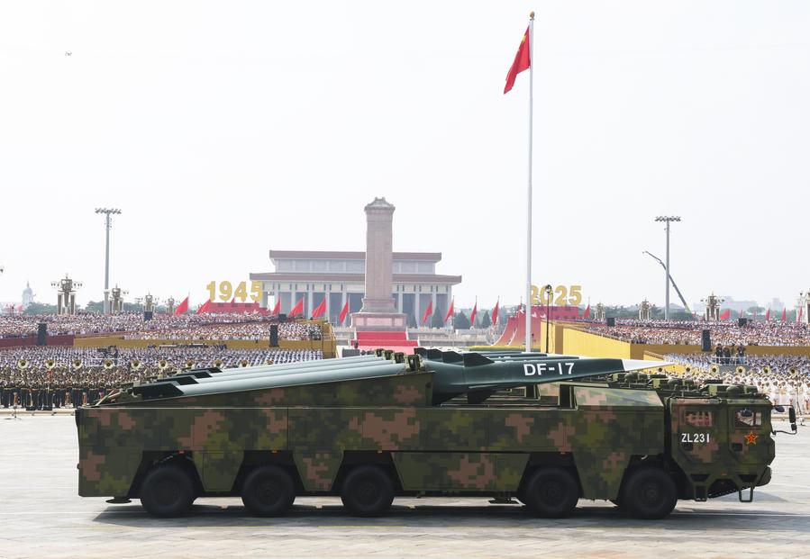 3日、観閲を受ける極超音速ミサイル方隊。(北京=新華社記者/劉大偉)