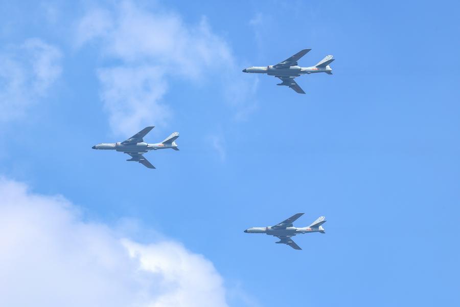3日、閲兵式で観閲を受ける爆撃機編隊。(北京=新華社記者/孫凡越)