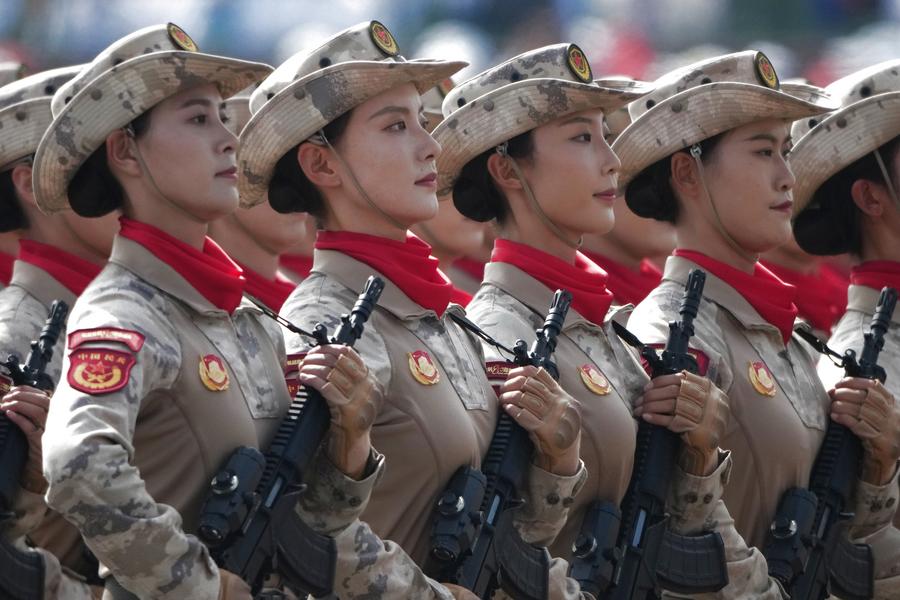 3日、観閲を受ける民兵方隊。(北京=新華社記者/李一博)