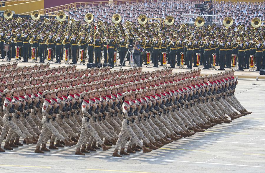 3日、閲兵式で、天安門広場を通過する地上突撃方隊。(北京=新華社記者/江漢)