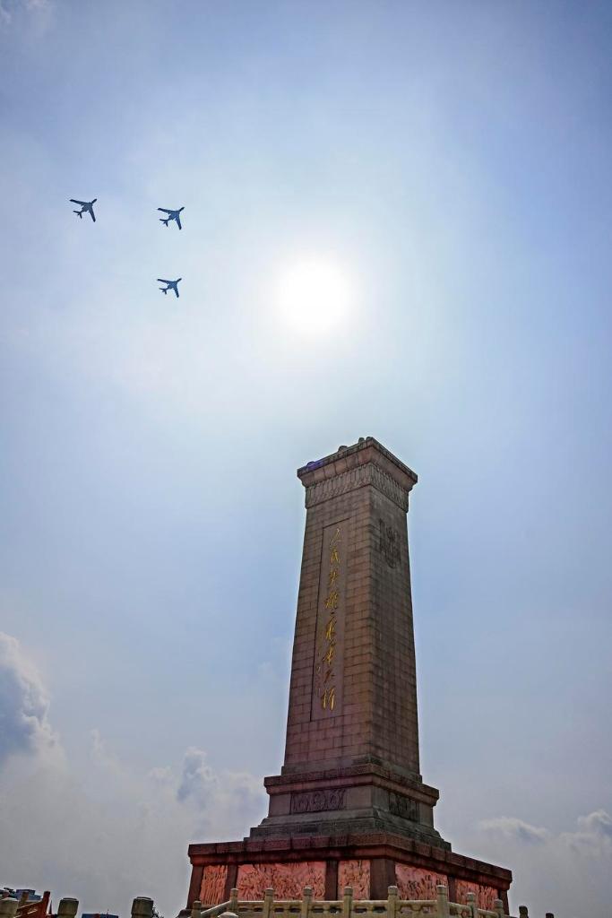 3日、天安門広場の上空を飛ぶ早期警戒管制機の梯隊。(北京=新華社記者/江文耀)