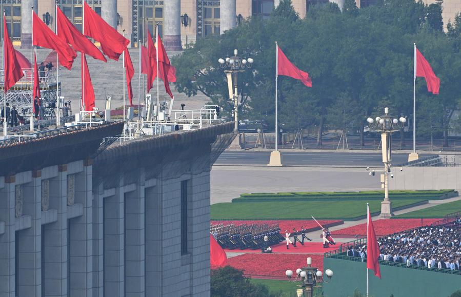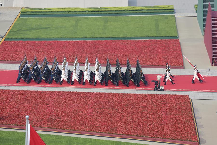 3日、五星紅旗を護衛しながら、天安門広場の人民英雄記念碑から國旗掲揚&へと行進する國旗護衛隊の將兵。(北京=新華社記者/杜宇)