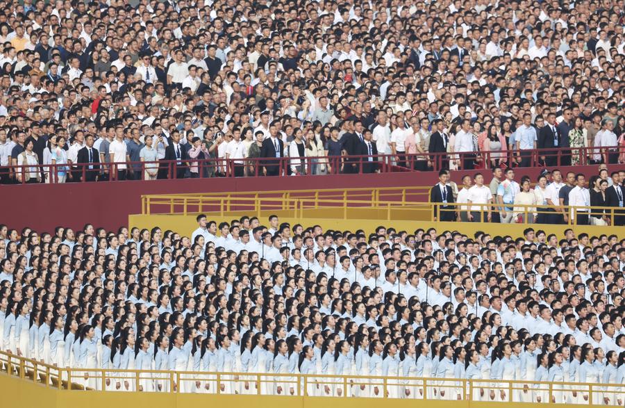 3日、中國人民抗日戦爭・世界反ファシズム戦爭勝利80周年記念大會の會場。(北京=新華社記者/金立旺)